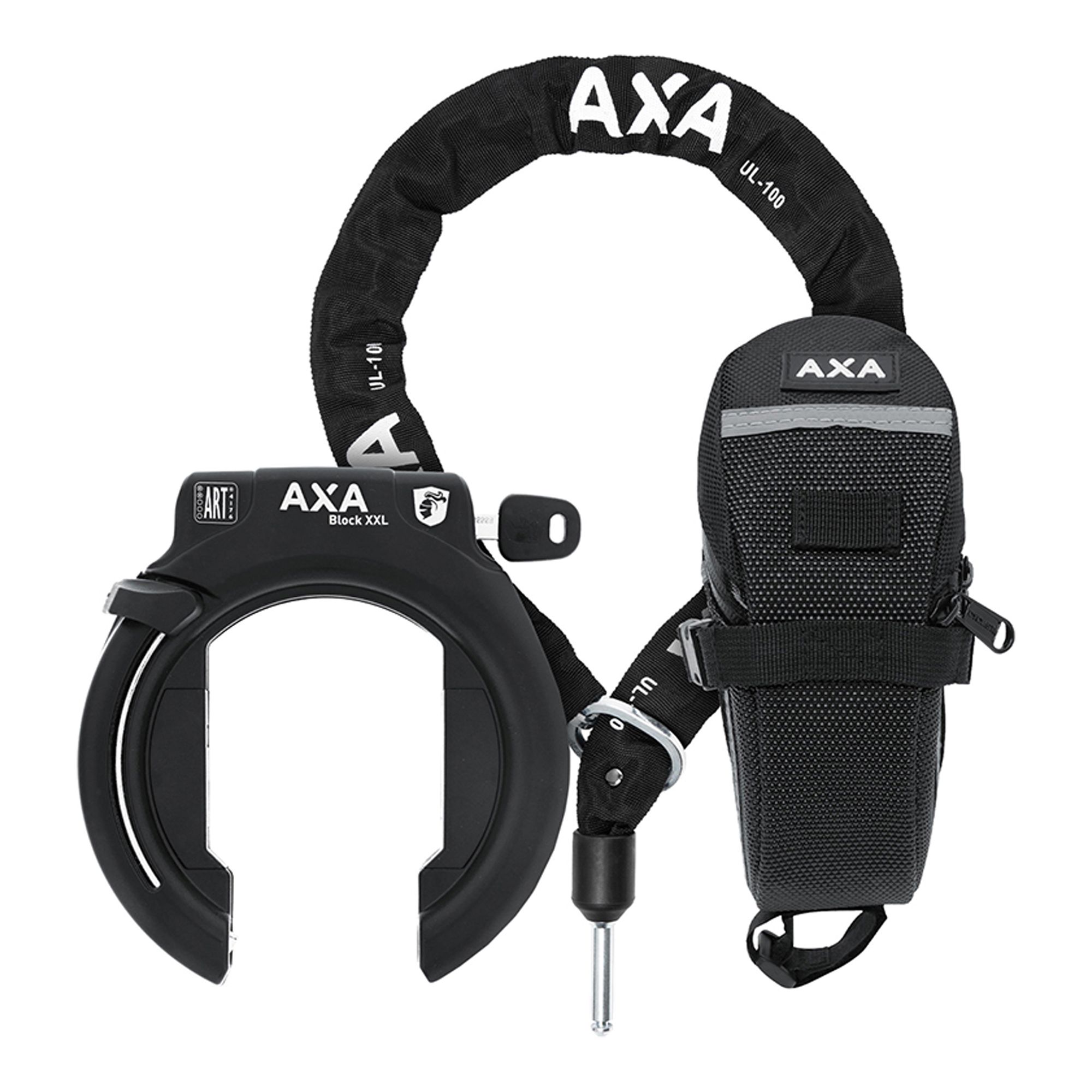 Det här setet innehåller AXA Block XXL, ULC 100 plug-in-kedja och en praktisk sadelväska. AXA Block XXL är ett högkvalitativt cykellås som erbjuder optimal säkerhet tack vare en borrskyddad cylinder och en bygel i härdat stål. Den ergonomiska designen på tryckknappen och möjligheten till nyckelbeställning online ger maximal bekvämlighet.