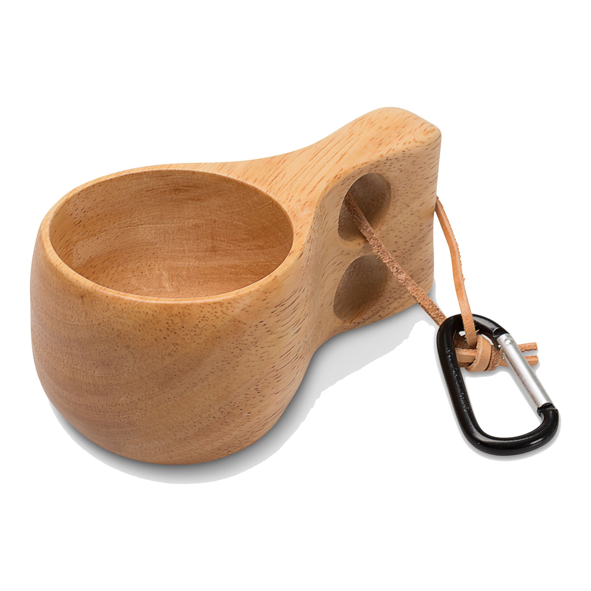 Tvåfingerskåsa i trä. Lätt att fästa på ryggsäcken eller i bältet med tillhörande karbinhake.