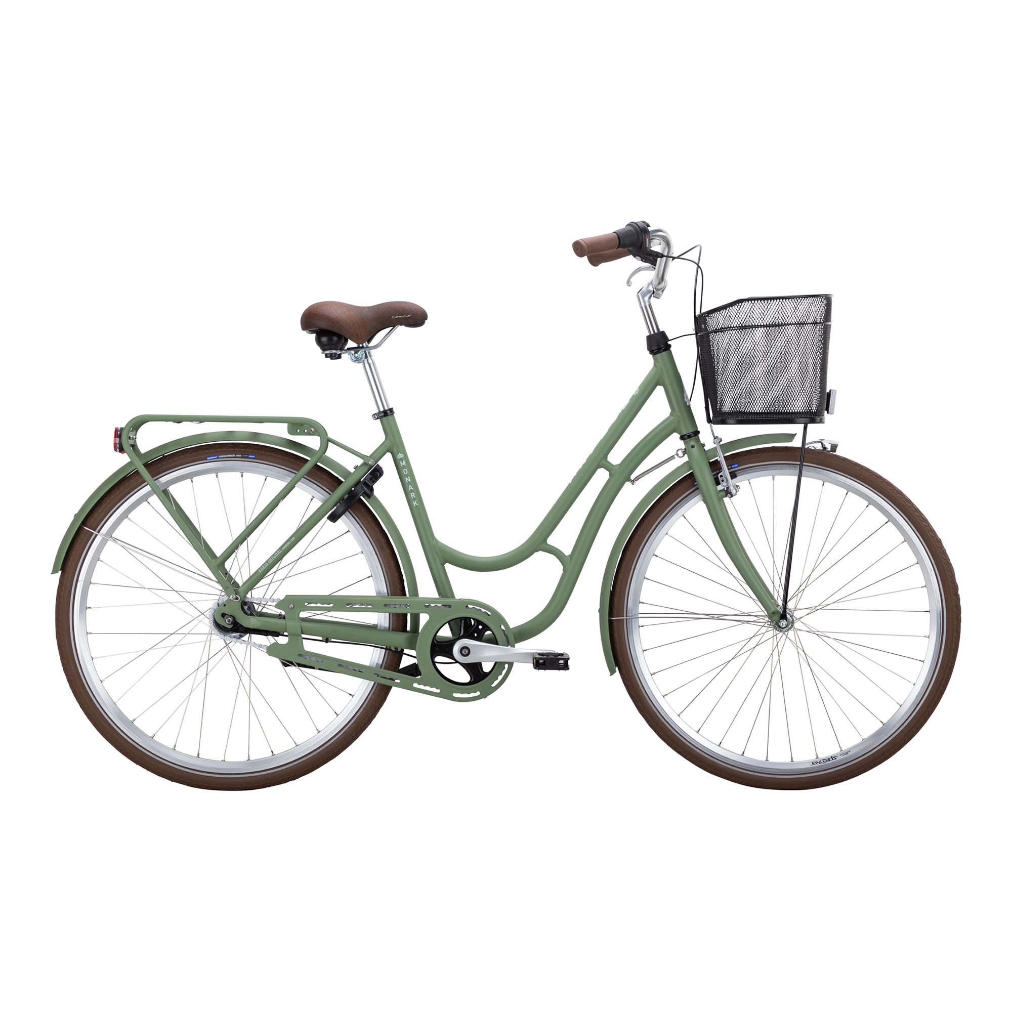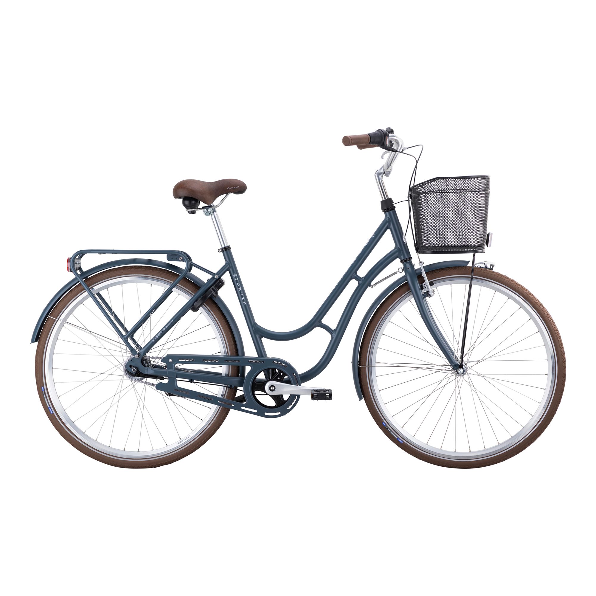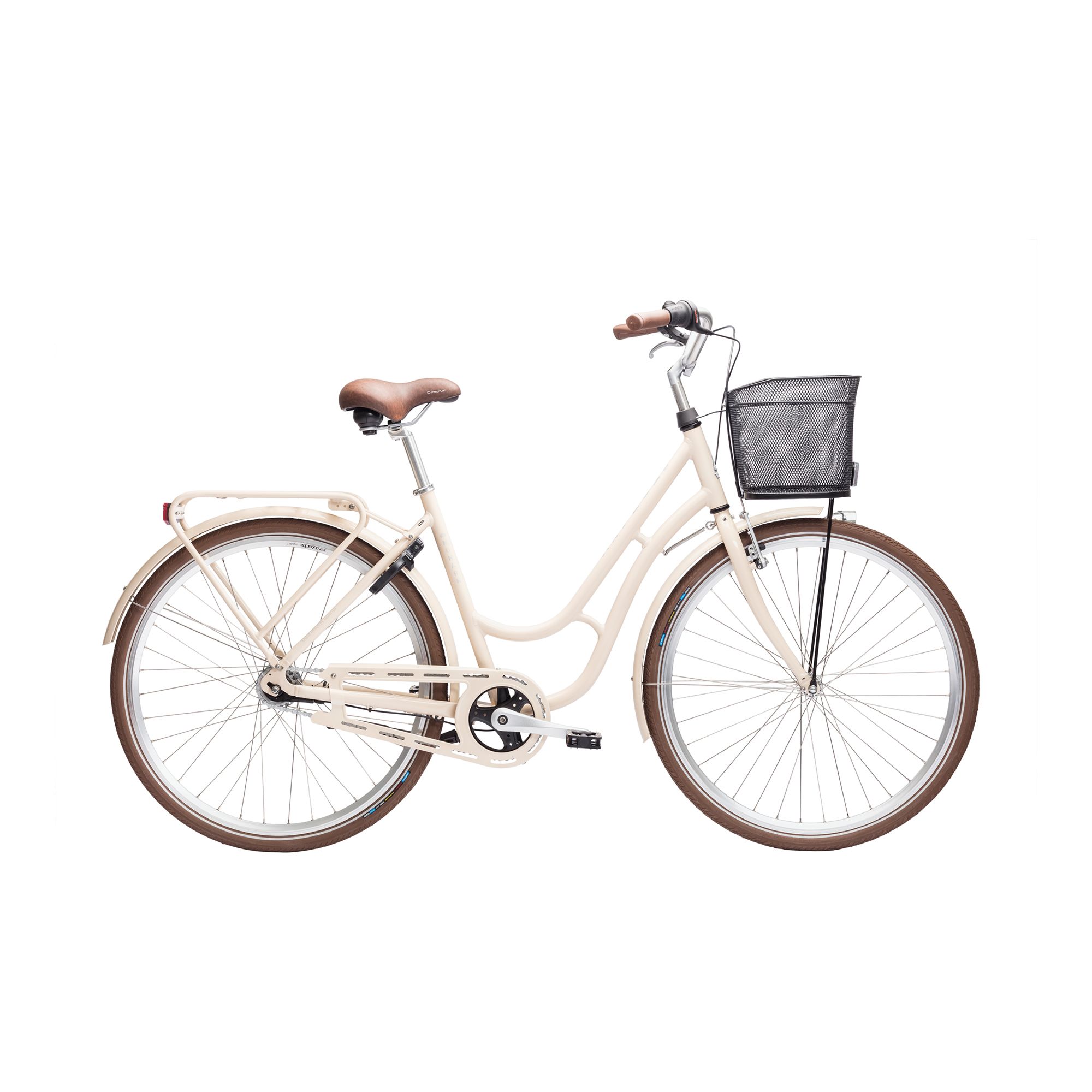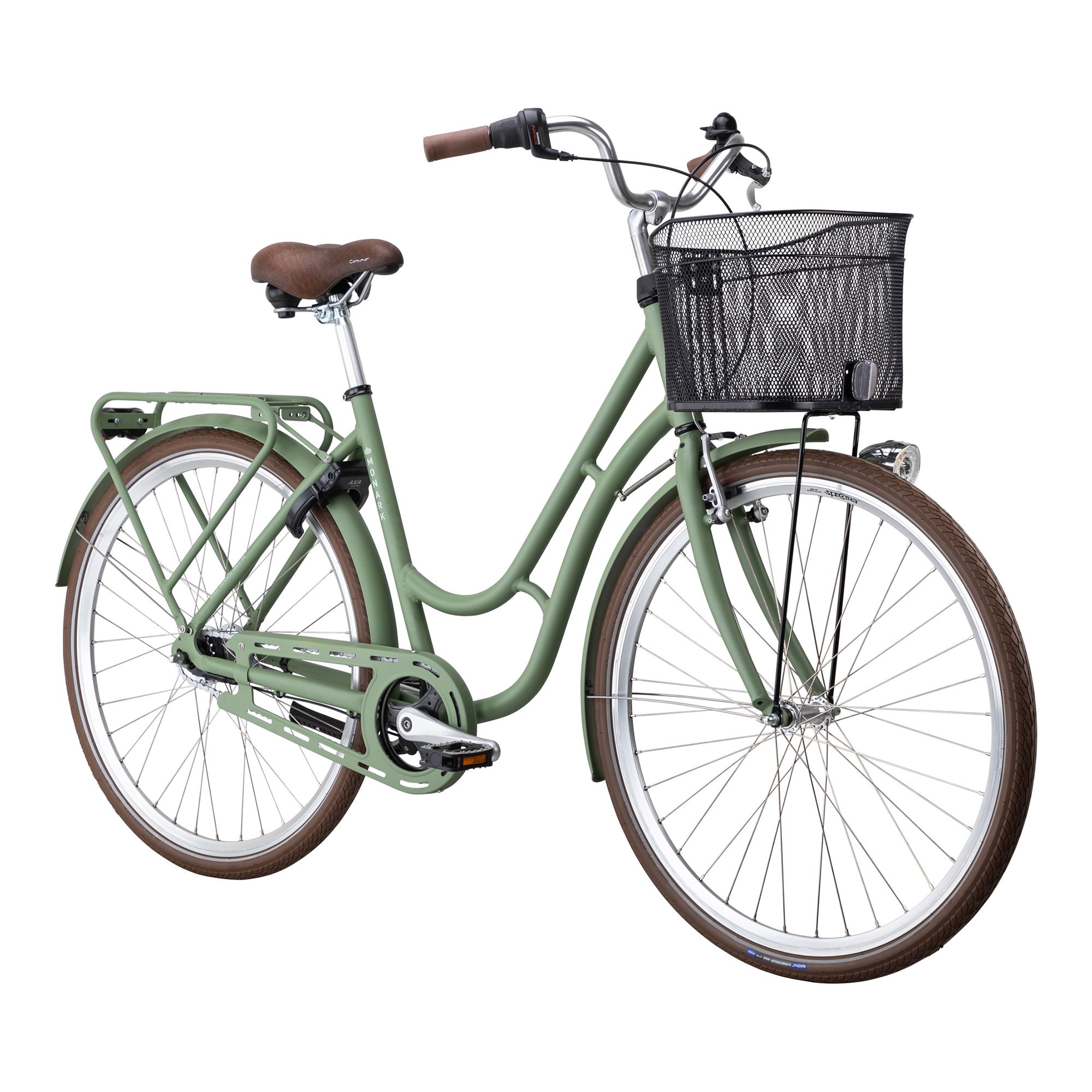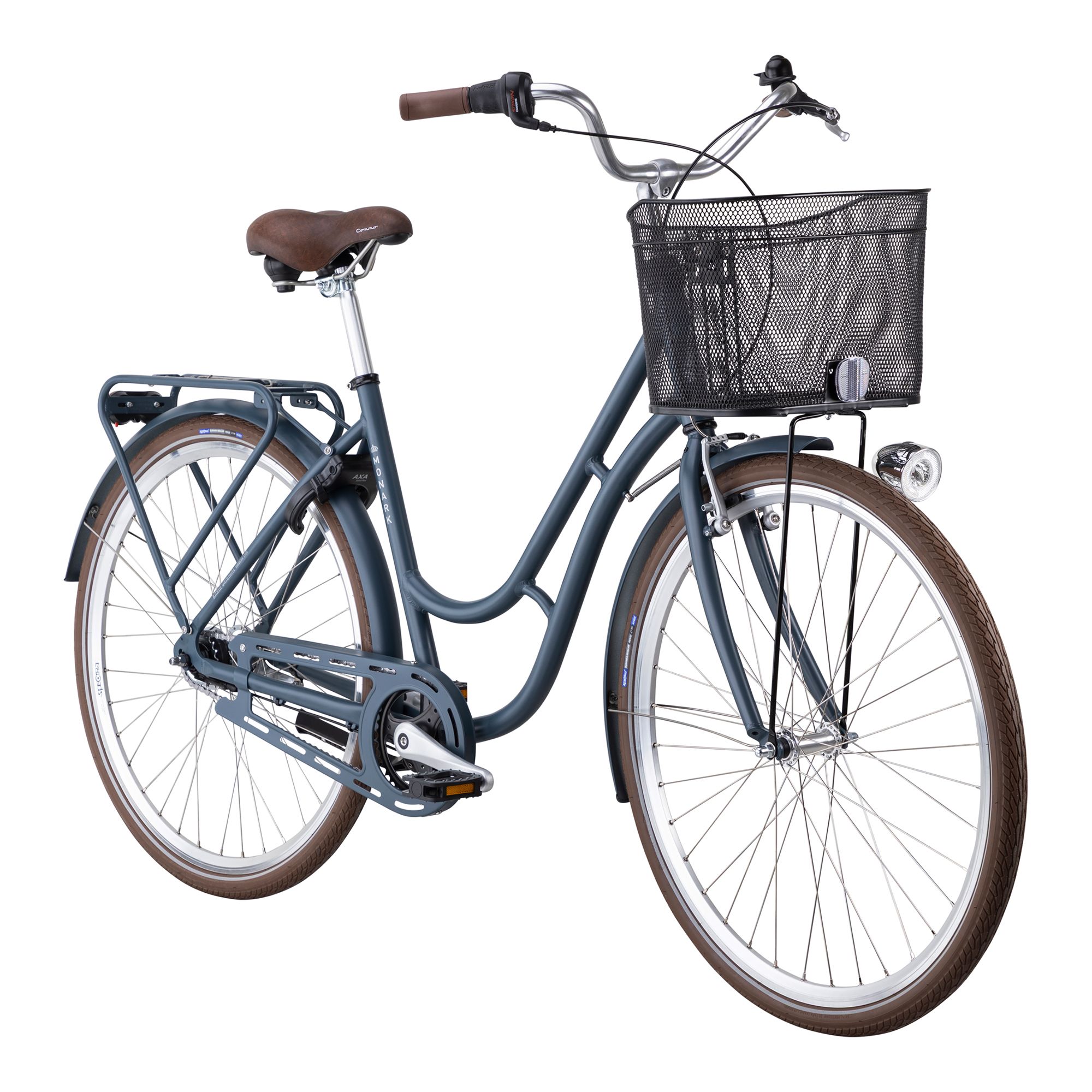 Med sju växlar har du alltid rätt kraft i pedalerna, och de ergonomiska handtagen ger extra komfort. Cykeln är komplett utrustad med robusta skärmar i plåt, pakethållare, lås, stöd, ringklocka och belysning, vilket gör den redo för alla väder. Korgen fram och AVS-klickfästen på pakethållaren gör det enkelt att ta med allt du behöver – en pålitlig följeslagare i vardagen.