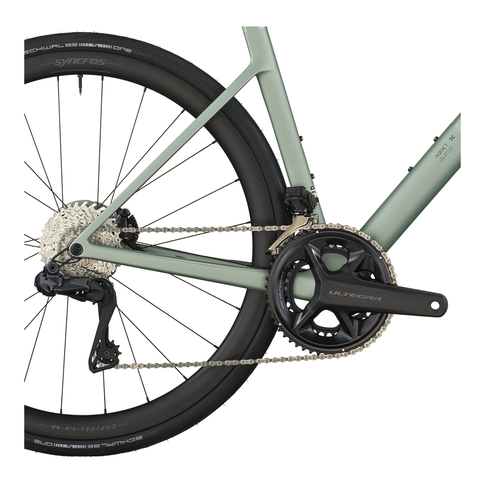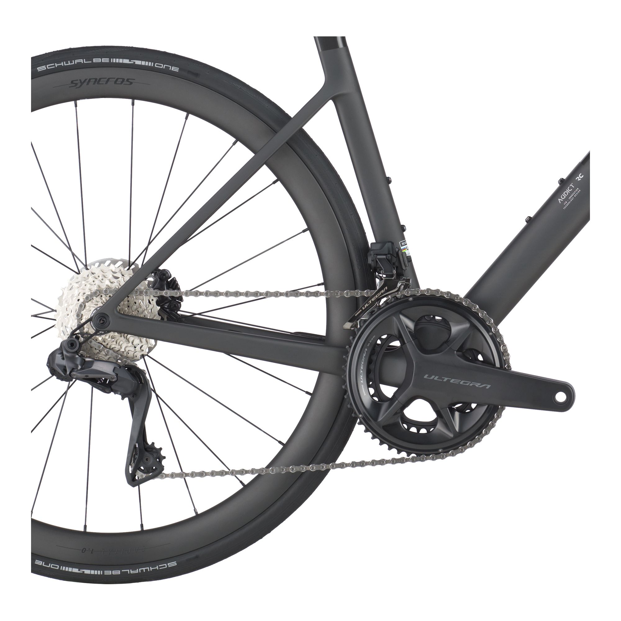 – Ram: Addict RC HMX, road race-geometri, utbytbart växelöra, intern kabeldragning