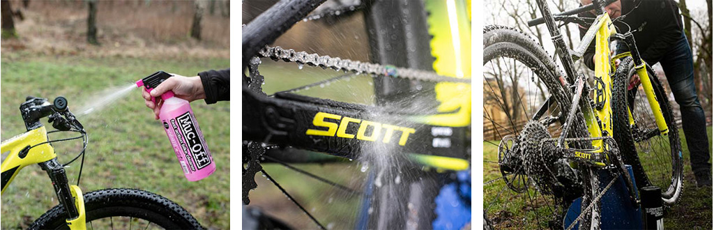 Spraya hela cykeln med tvättmedel. Vi rekommenderar Muc Off Bike Cleaner som är riktigt bra på att lösa upp smuts. Har du en cykel som är väldigt smutsig på kedja och kassett så finns ett annat tvättmedel som heter Muc Off Chain Cleaner. Den är bra på att lösa upp olja, fett och smuts. Den kan du med fördel använda på kedjan, kassetten och på växlarna. Låt det sitta i fem till tio minuter.