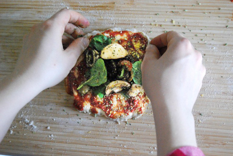 Häll ut degen på mjölat bakbord och knåda eventuellt in lite mer mjöl om det behövs för att den ska vara hanterbar. Dela degen i 10–12 lika stora delar och kavla ut dem till små, runda pizzabottnar på mjölat bakbord. Tillsätt mer mjöl om degen är för lös, men försök att inte arbeta den för mycket. Bred ut ett tunt lager tomatpuré och lägg ca 1 dl av fyllningen i mitten.